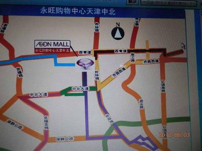 永旺夢楽城天津商業有限公司。イオンモール中北店行きのシャトルバスは紫色の配色。地下鉄2号線曹庄駅直結だけれども、地下鉄開通前に様子が見たいと思う。
