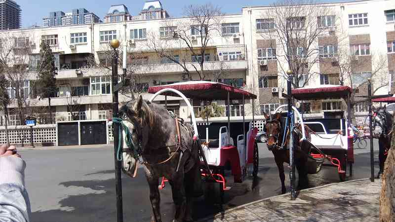 民園前に馬車乗り場がある。歩いてる人よりも御者の数が多いような氷点下の季節だった。馬はおとなしい。気温が上がるに連れて地元の観光客が老いも若きも歩くようになった。小さな博物館が看板を出した。写真も外壁に貼りだしたり。去年は見てない。