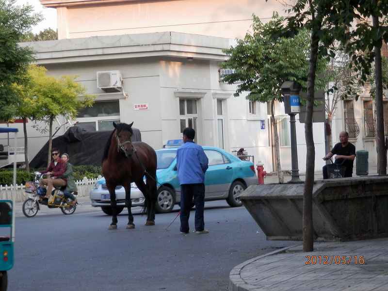 貸し自転車が民園前に並んだ。二人乗りは縦のも有れば横並びもある。寒い時期も馬は平然としていたが。最高に暑い7月はどうしているのか?- 旅行時期