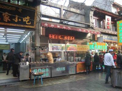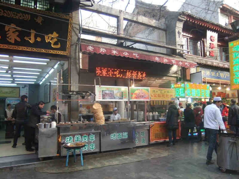 回民街の有名な「清真小吃」とはブタによる成分をいっさい用いずに料理された軽食。西安名物「羊肉泡膜(膜は実際のヘンは食)」は羊肉のスープに焼きパンを入れた食べ物。- 旅行時期