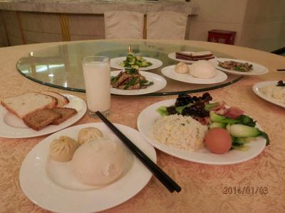 朝食はパンとウインナーと目玉焼き2個かまたはスクランブル。キャベツの千切りに甘いゴマのドレッシングがかかる。ホットコーヒー、ジュース、スイ カもついてくる。きょうはお粥が有りますと言う時もある。