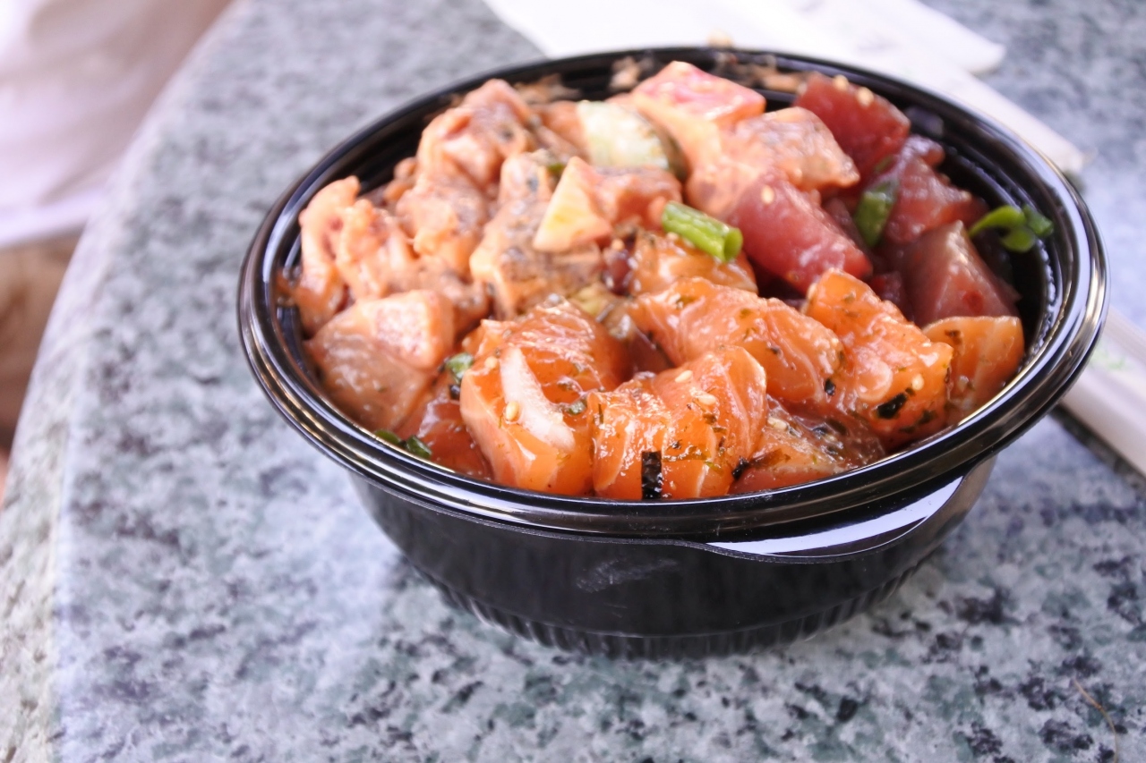三種のポキを選んでドンブリを作ってもらいました。何にするか、まごまごして時間がかかってしまいましたが、女性の店員さんは笑顔で終始対応してくれました。飲み物を冷蔵庫からチョイスして、レジでお支払い。カード買えました。