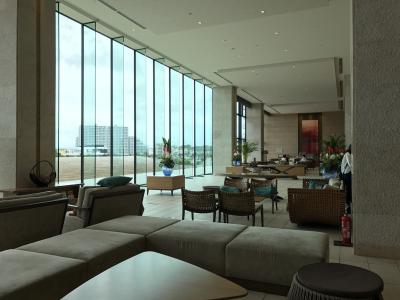 空港からは北谷地区行きのバスで移動しました。海では泳がすにプールを楽しみます。隣接したヒルトンガーデンインも利用可能です。朝夕の海を部屋から見ることができリゾート気分満載です。徒歩圏内にショッピングモールや食事ができる場所もあります。