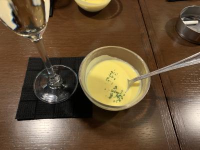 お通しに暖かいスープが出てきます。他にレバーパテ、生ハム、ピザをお願いしました。