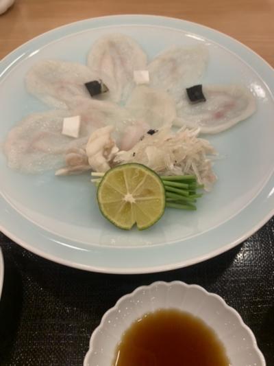 河豚ミニ懐石をいただきました。河豚の刺身、唐揚げ、鍋がついており、分量も適量で、美味しくいただきました。高齢の父親には少し量が多かったようです。