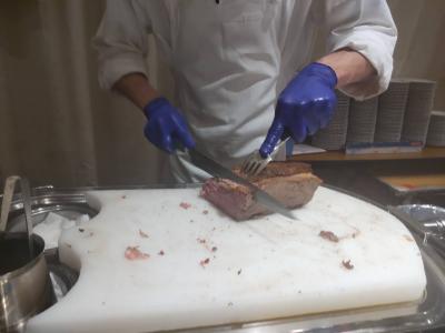 食事の目玉はローストビーフで、その場で切ってくれるのをいただけます。