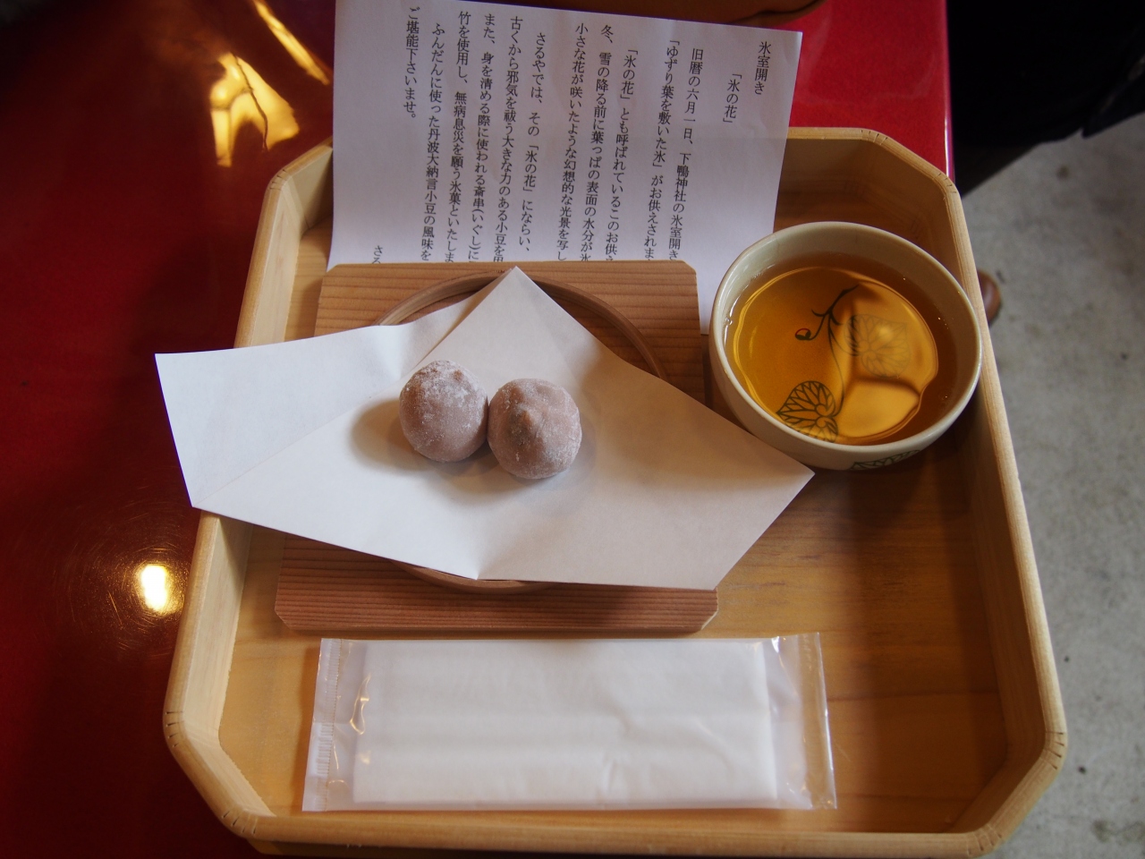 申餅をいただきました。一口サイズのお餅が2つとほうじ茶。300円ちょっとだったと思います。あんこではなく、甘く煮たあずきが入ったお餅はほんのりした甘さで美味です。