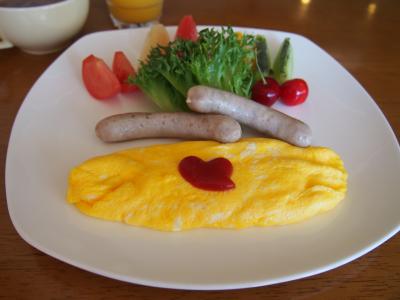 朝はパンとサラダとオムレツ、ヨーグルト。それとセルフでドリンクとスープが用意してあります。