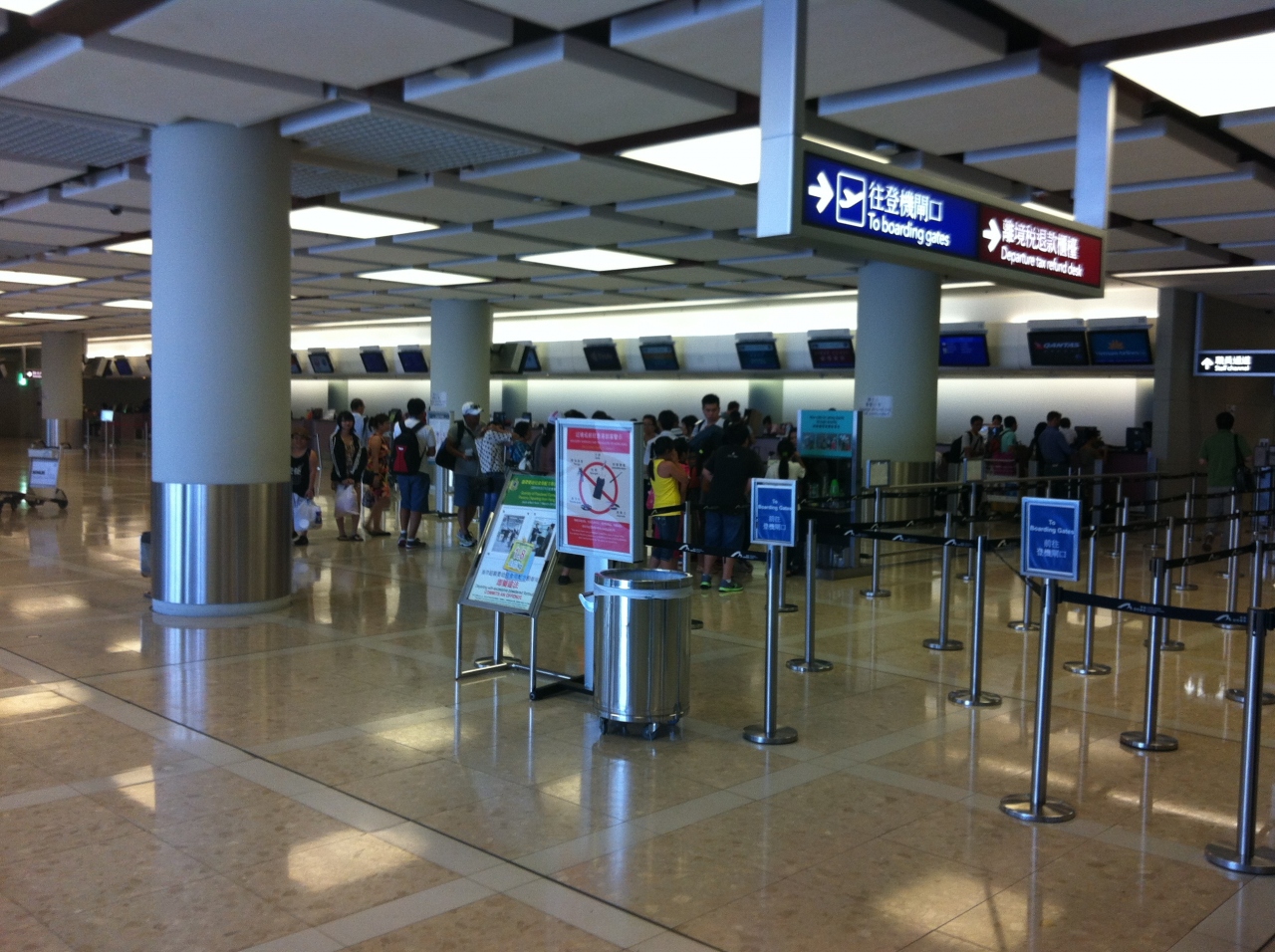チケットを購入したら、次に左側のカウンターでチェックイン。特にJAL、キャセイなど8つの航空会社はここでバッゲージもチェックイン可能なので手ぶらで便利。ただしフライトの3時間前、フェリー出航の1時間前のチェックインが必要。(ちなみに出航20分前の駆け込みの経験も有りますが、日本まで無事に荷物が着きました。)ANAなど他の航空会社のバッゲージチェックインは空港桟橋到着後におこないます。フェリーを下船して直ぐのところにチェックインカウンターが並んでいますので、モニター画面で航空会社を探してください。