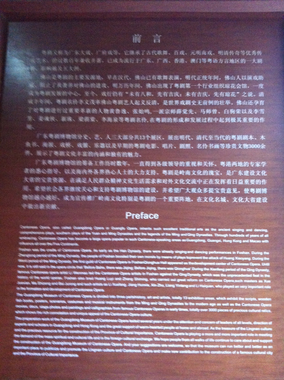 その粤劇の歴史をたどり、明王朝、清王朝時代からの作品の紹介や、楽器、衣装なども展示されています。