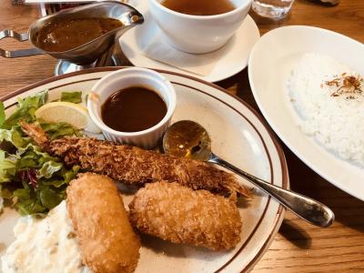 エビフライとカニクリームコロッケのセットにミニカレーをつけて。贅沢な組み合わせで、ご飯少なめにしたけどお腹いっぱい。