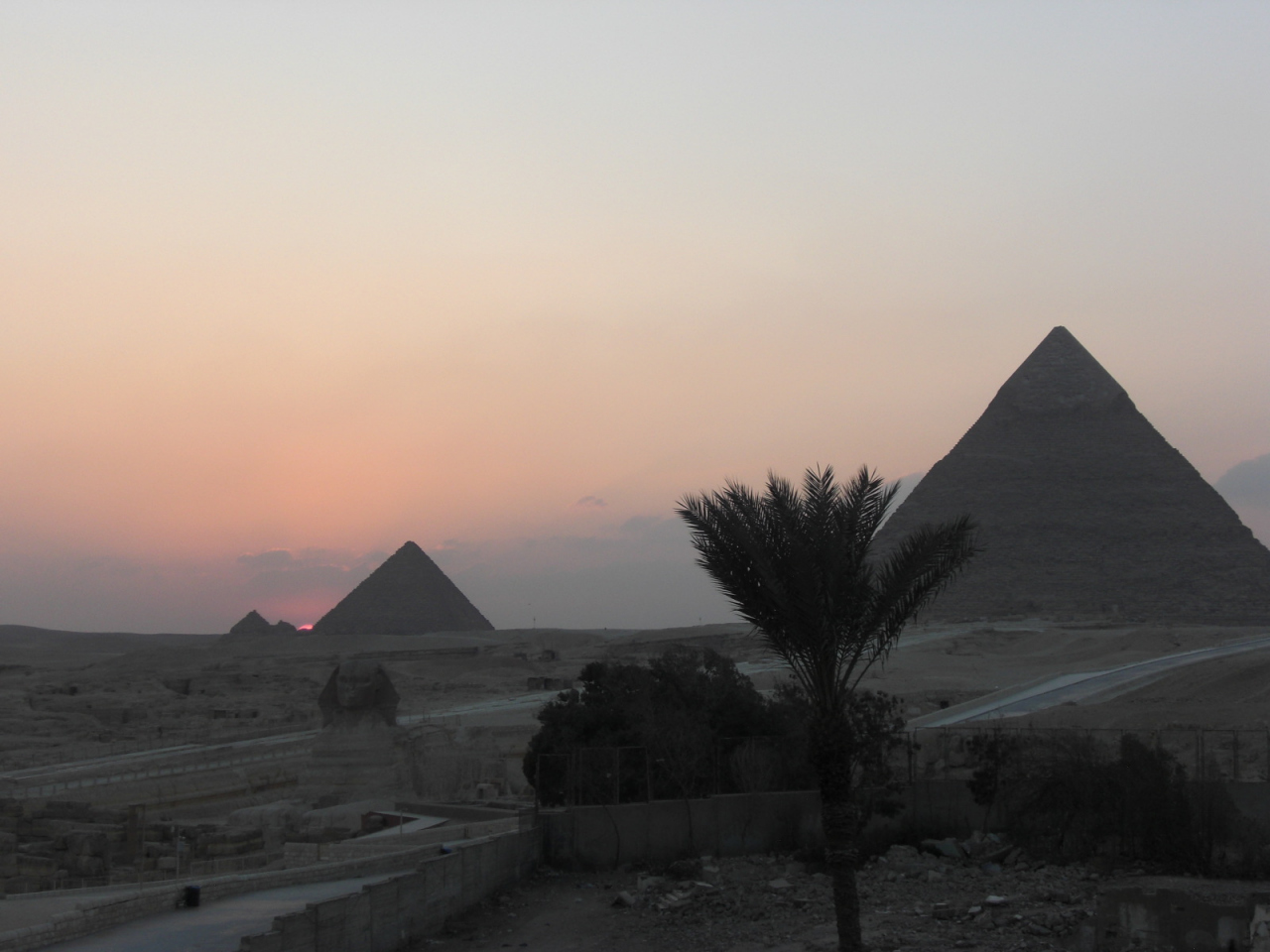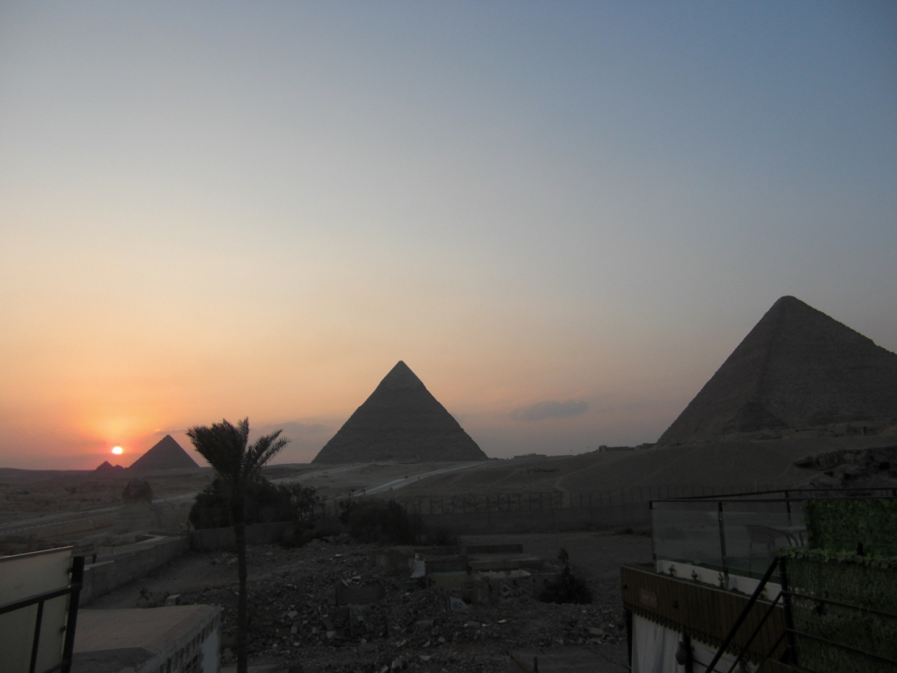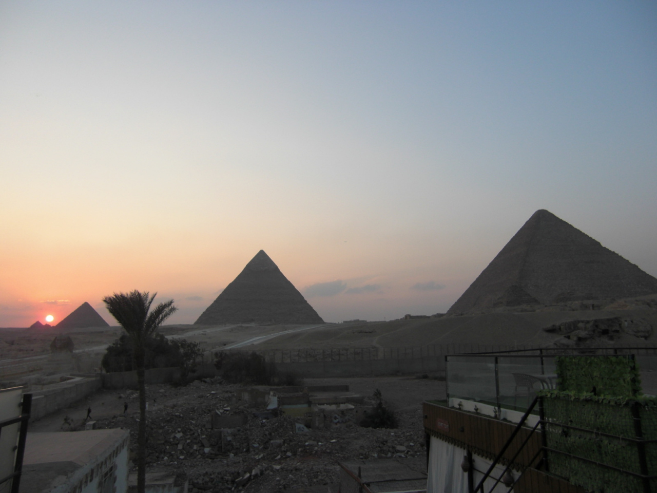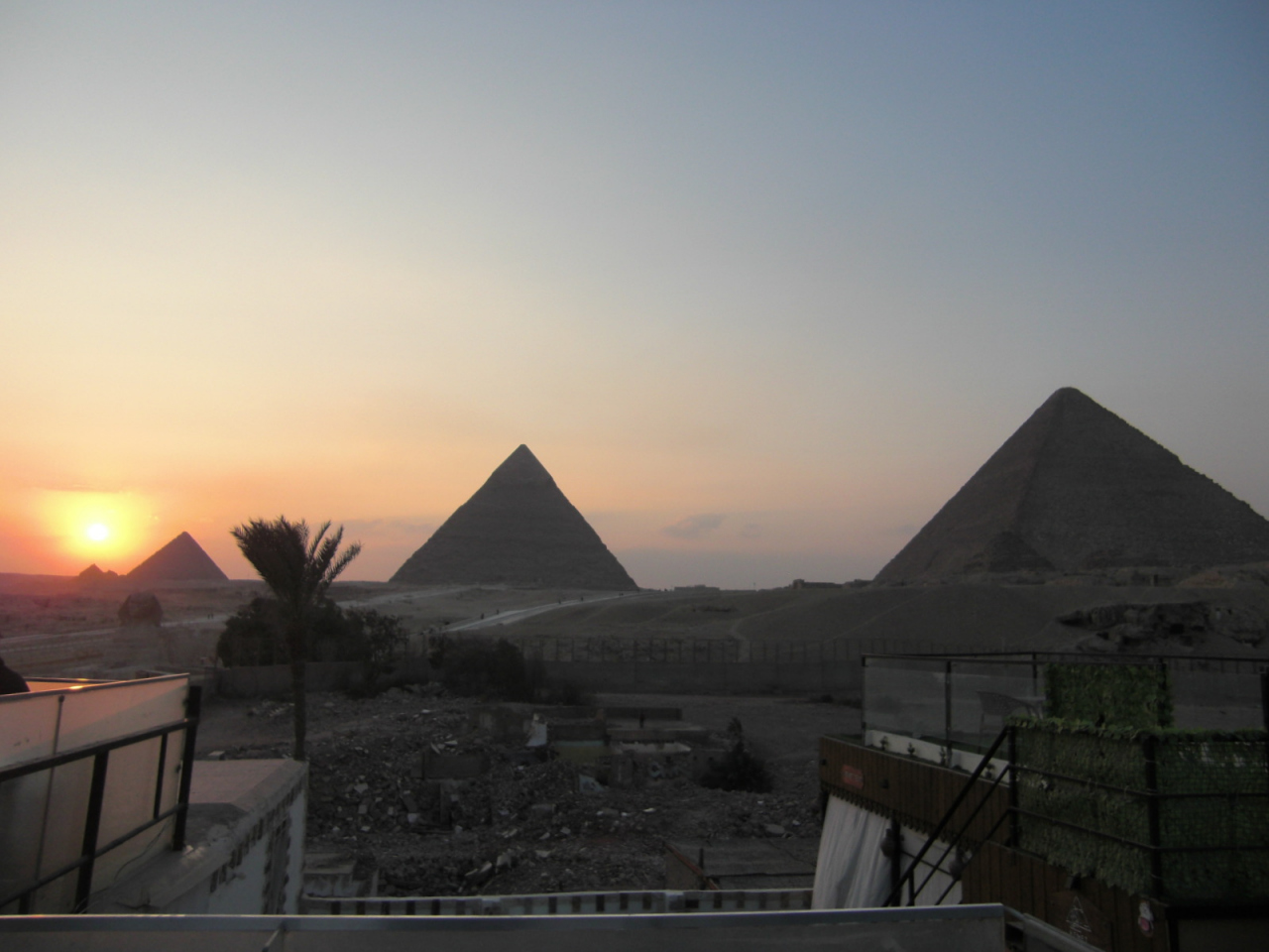 ギザの宿泊ホテルWhite House Piramids Viewの屋上テラスからはメンカウラー王のピラミッド横に沈む サンセットが見渡せました。