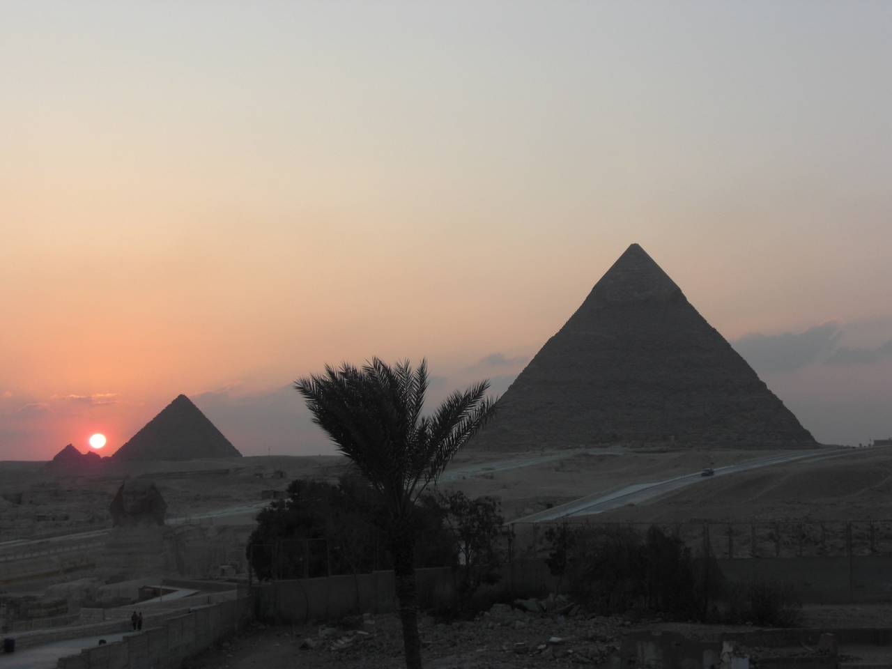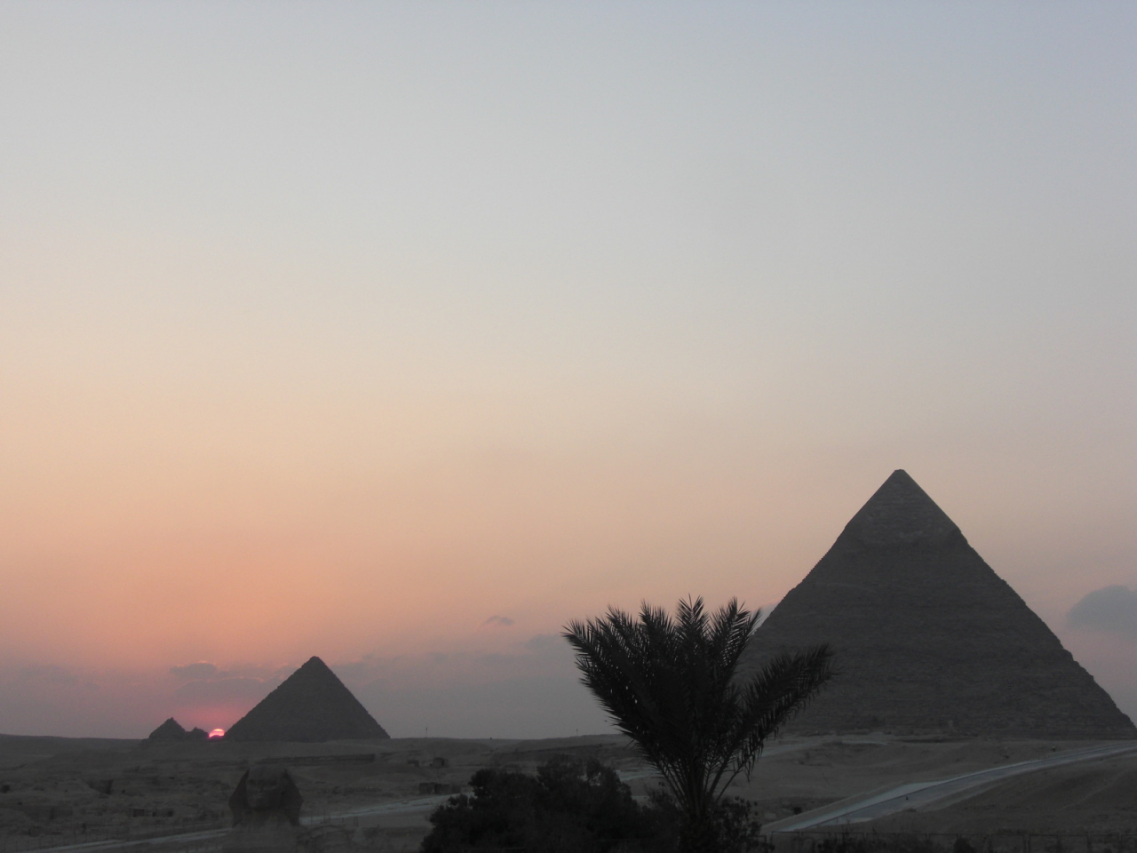 メンカウラー王ピラミッドとカフラー王ピラミッドの間に沈むサンセット
