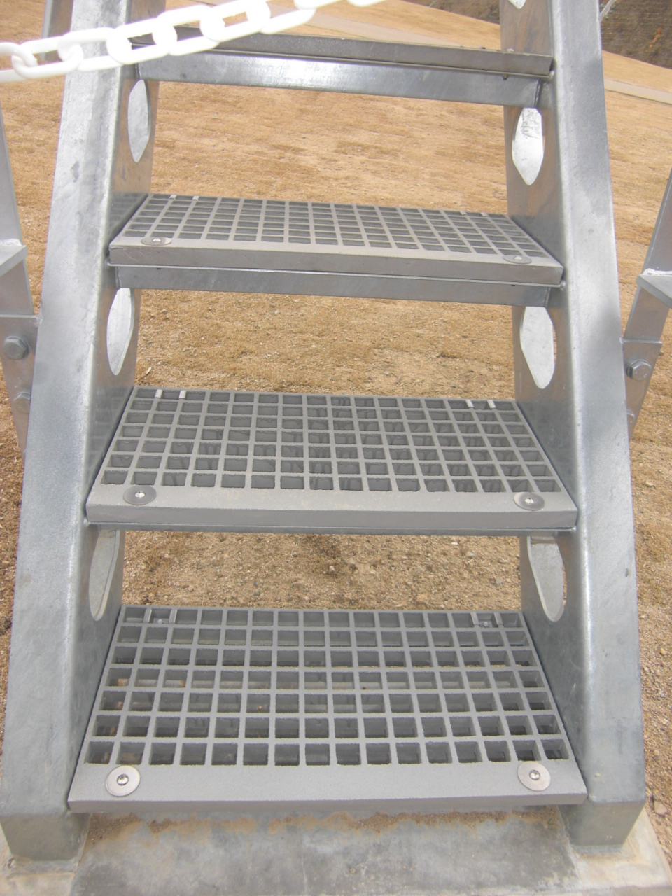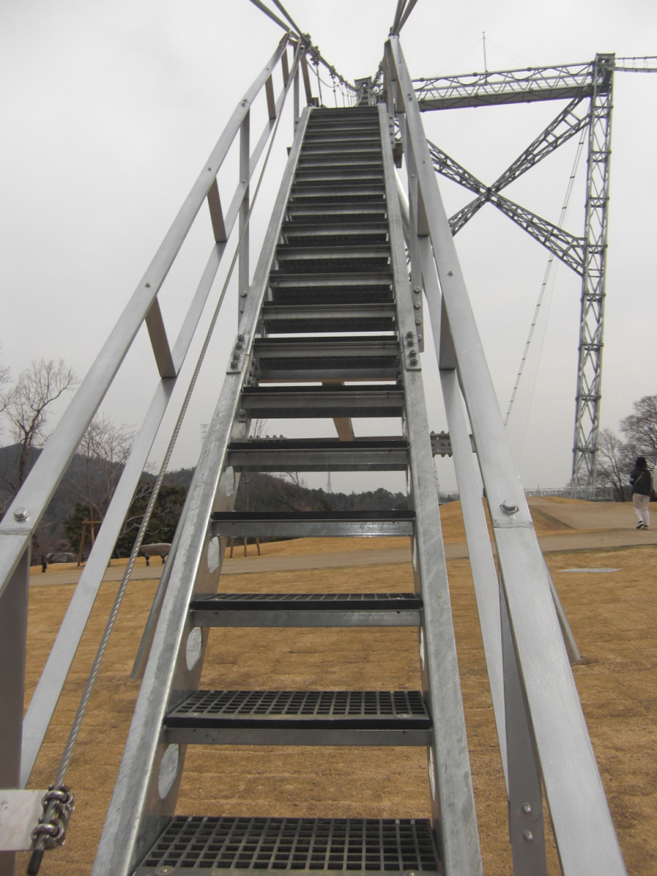 右岸側の60mの頂上までスタッフの先導で上り210段の階段をハーネスに装着されたケーブルをレールにかけて上がって行きます。