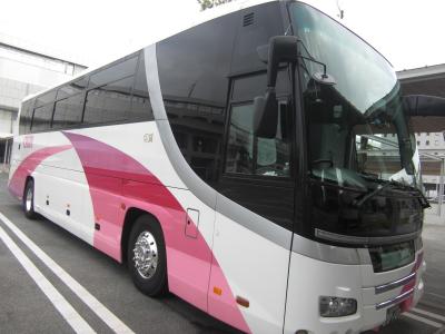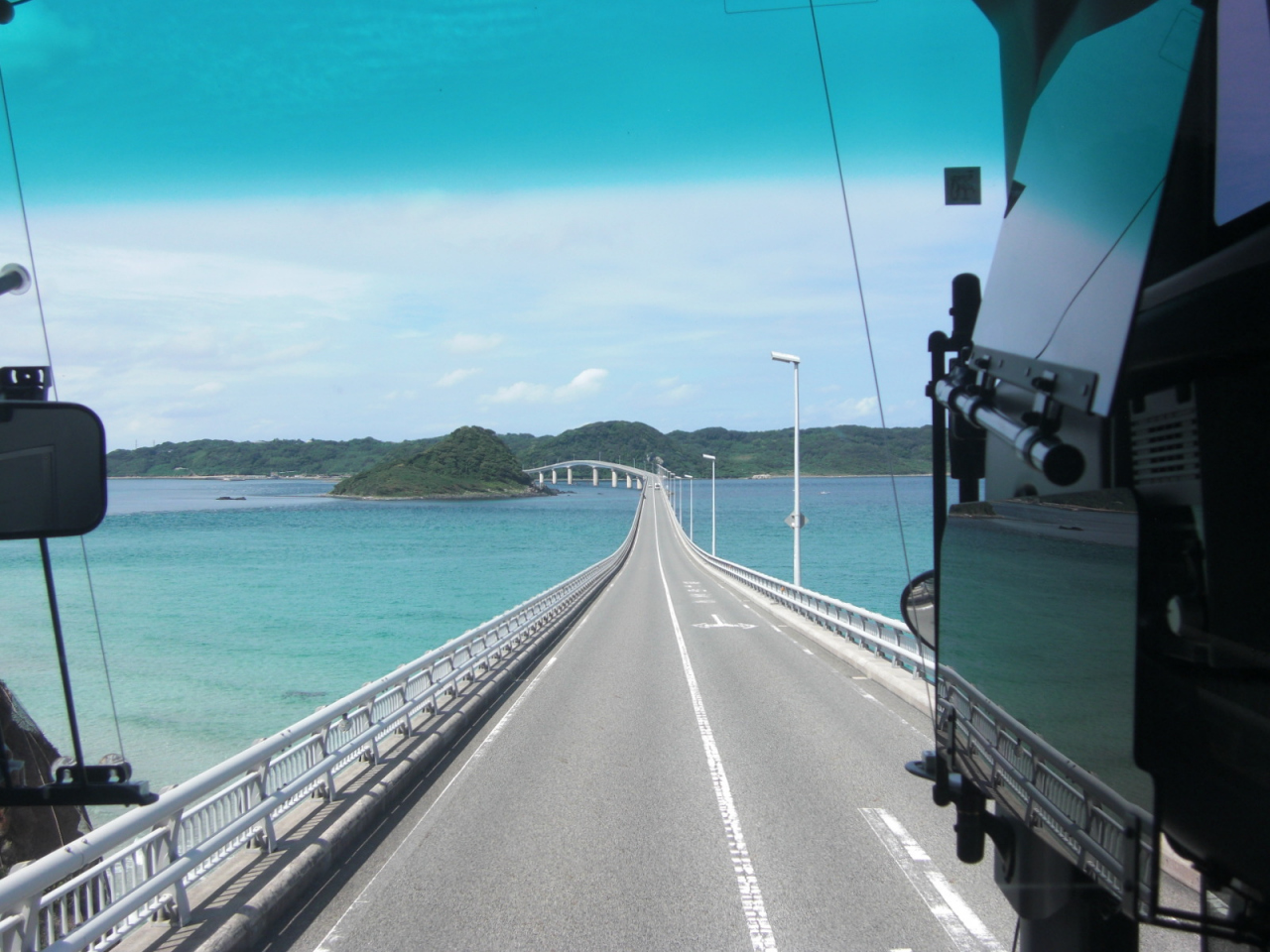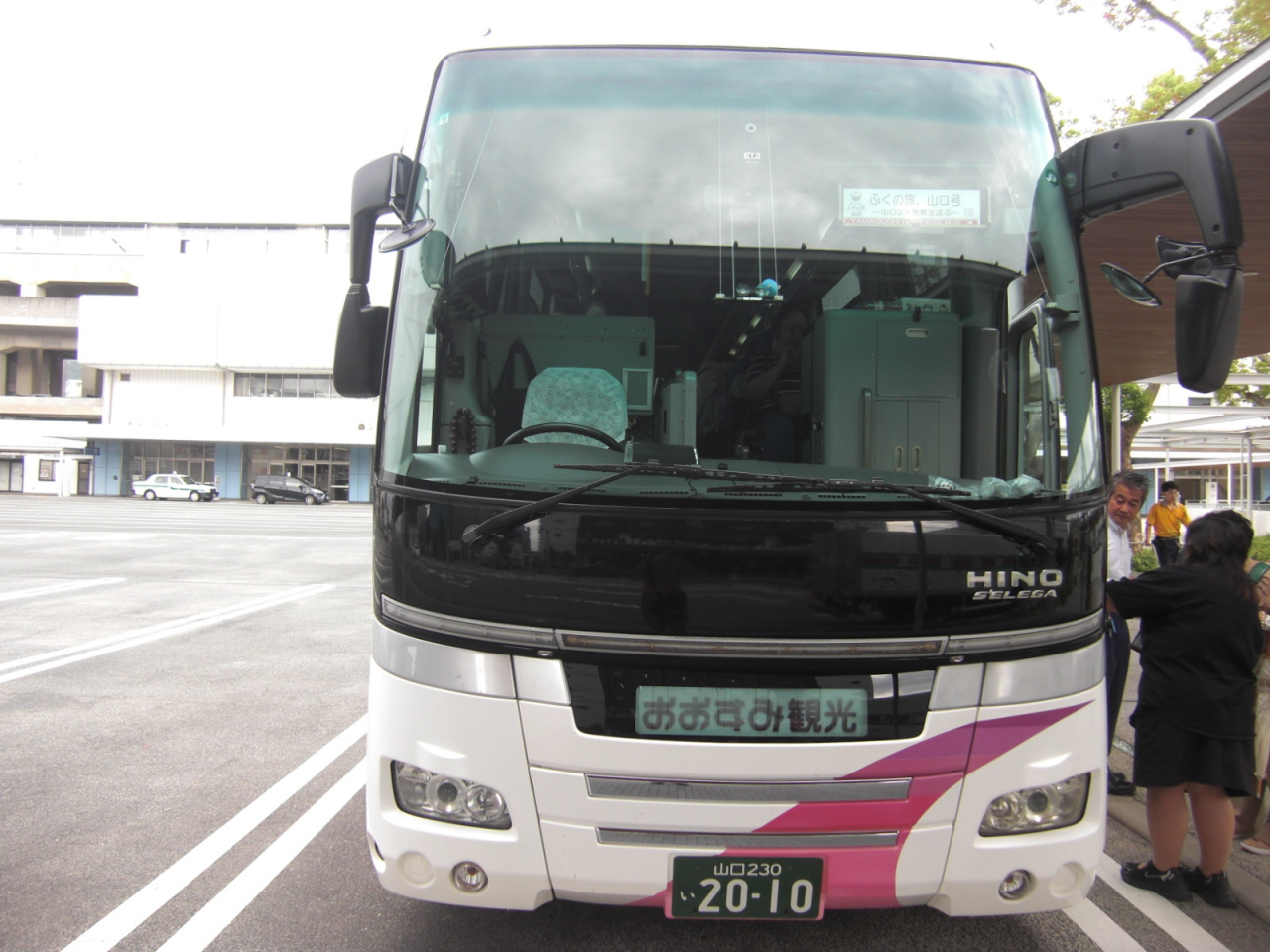 翌朝9時にホテル前から角島大橋&元の隅神社の日帰りバスツァー【ふくの旅、山口号】が出発、部屋からツアーバスの到着を見届けてバス車内にに乗り込むことも出来ました。