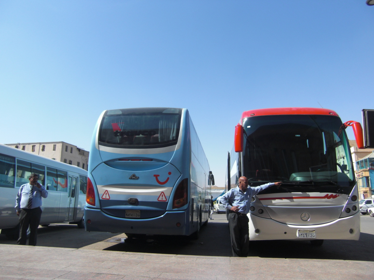 アブ・シンベル空港からのエジプト航空の無料シャトルバスは空港の到着口の広場を挟んだ向こう側のバス待機所の向かって一番右端に待機しています