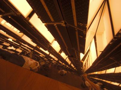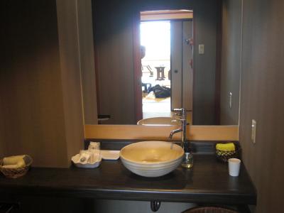部屋から1階の温泉までは廊下を移動しますが両面の壁が黒く照明も暗いので壁を明るい色にして照明も明るくすればいいのになあと思いました。