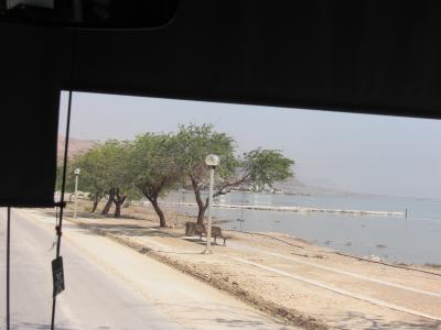バスは死海のビ-チ沿いを走り進行方向右側にずっと死海が見渡せ同時にヨルダン側のホテル群も見渡す事が出来ます。