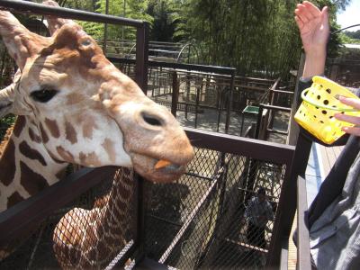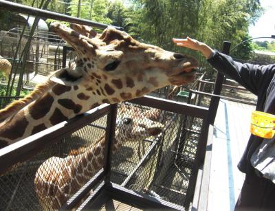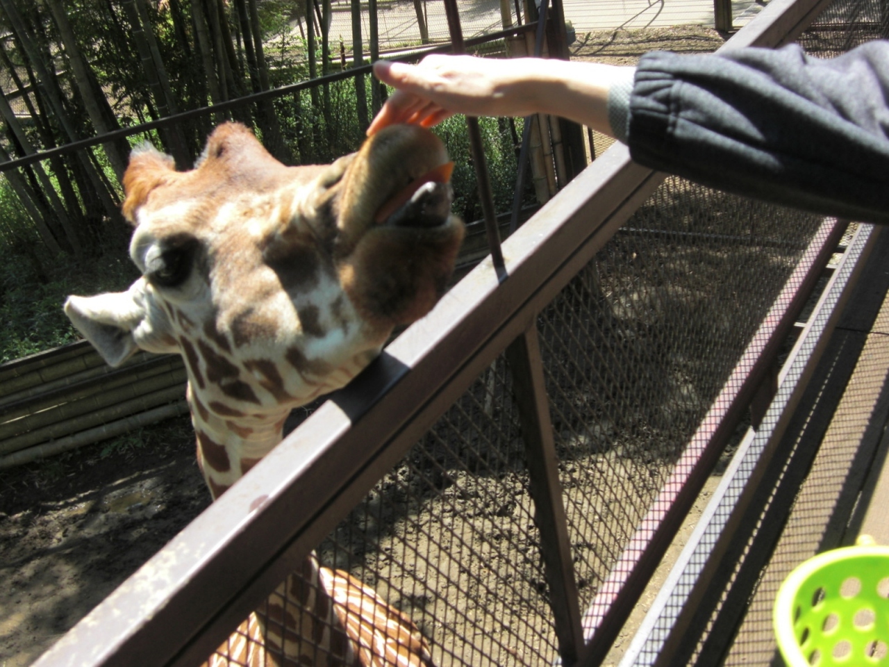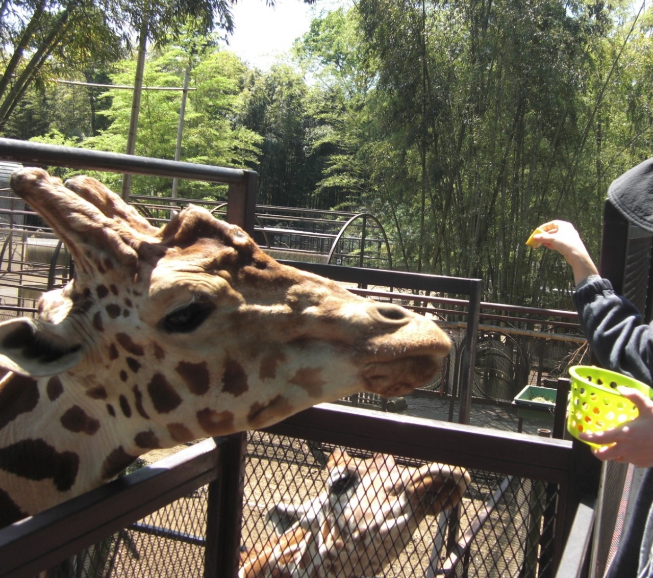 キリン、朝はお腹を空かしているので朝一番の入場で餌(500円)を購入して同じ目線でキリンに餌をやりながら触れ合えました。