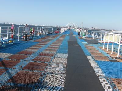釣り竿をレンタル、餌も売店で買っていよいよ桟橋へ行き風速12mの中での釣り。