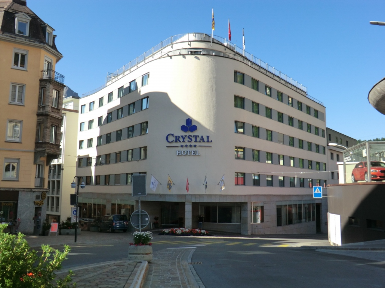 サンモリッツ中心街は坂の上に位置しクリスタルホテルも中心街のバス乗り場前で分かりやすい場所にあります。