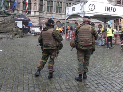 人の集まるスポットの警備は万全、アントワ?プ駅の警備も兵士が写真のような銃の持ち方でしっかり警備していました。