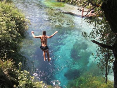 ブル-アイではたくさんの人が泳ぎ、湧き出る泉に飛び込む人も列に並んで待つ状態。