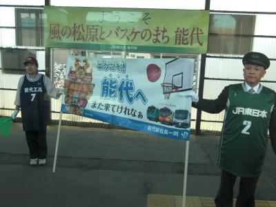 能代駅では15分停車して太鼓の演奏を聞いたり太鼓をたたかせて貰ったりこの町で人気のあるバスケットボ?ルにトライ出来ます。