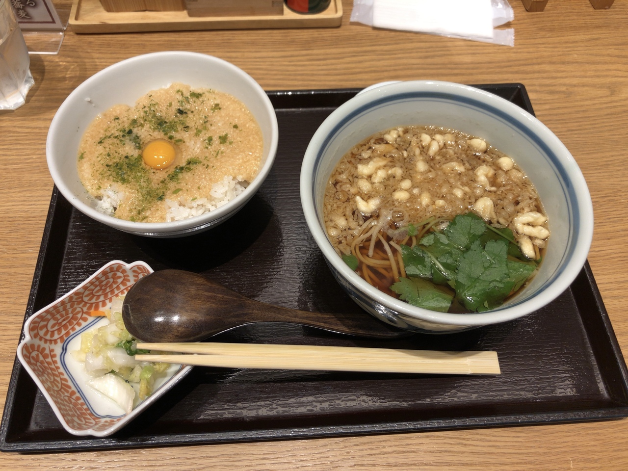 シラス丼かとろろ丼か悩み、とろろ丼と温かいたぬき蕎麦に。量は、男性は少し足りないかな。