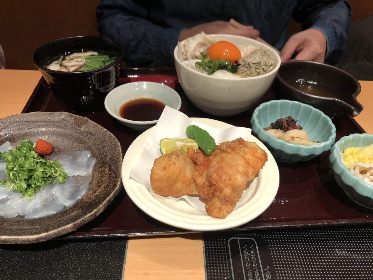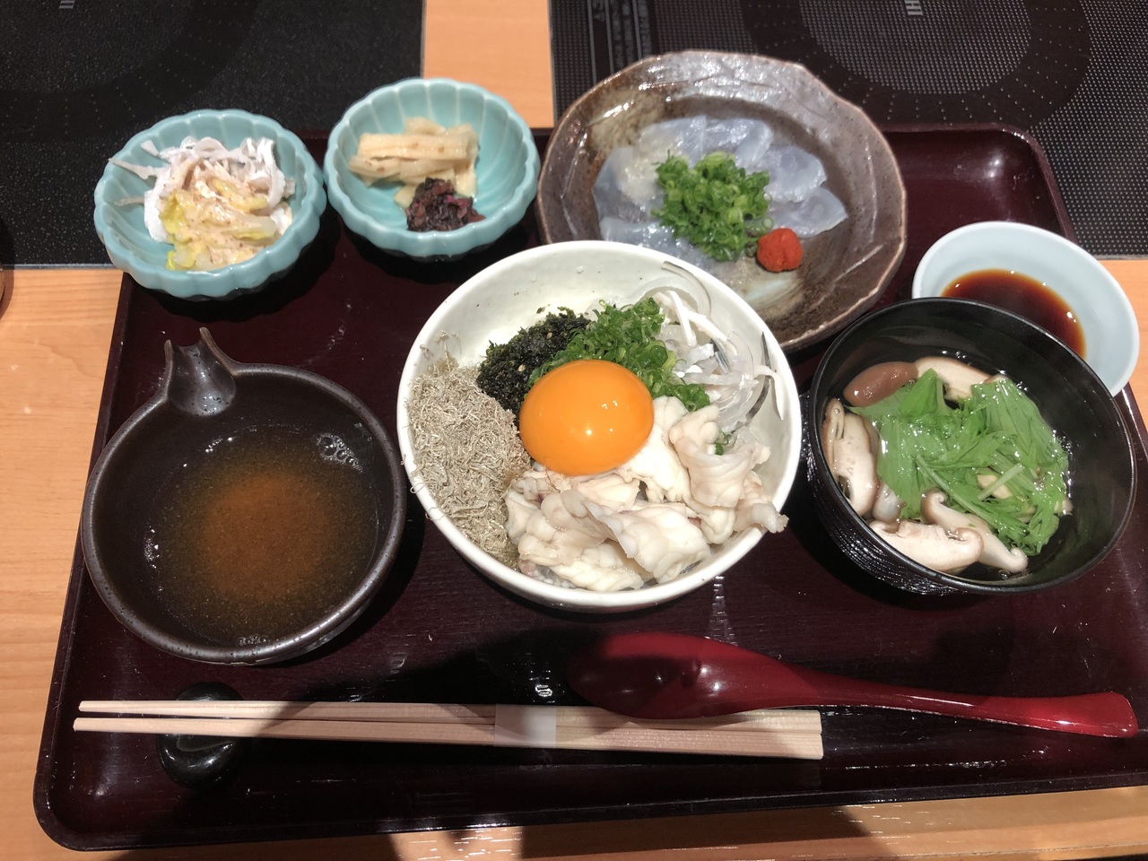 ふぐご飯は、色々な具が乗っていて黄身と出汁と混ぜていただきます。