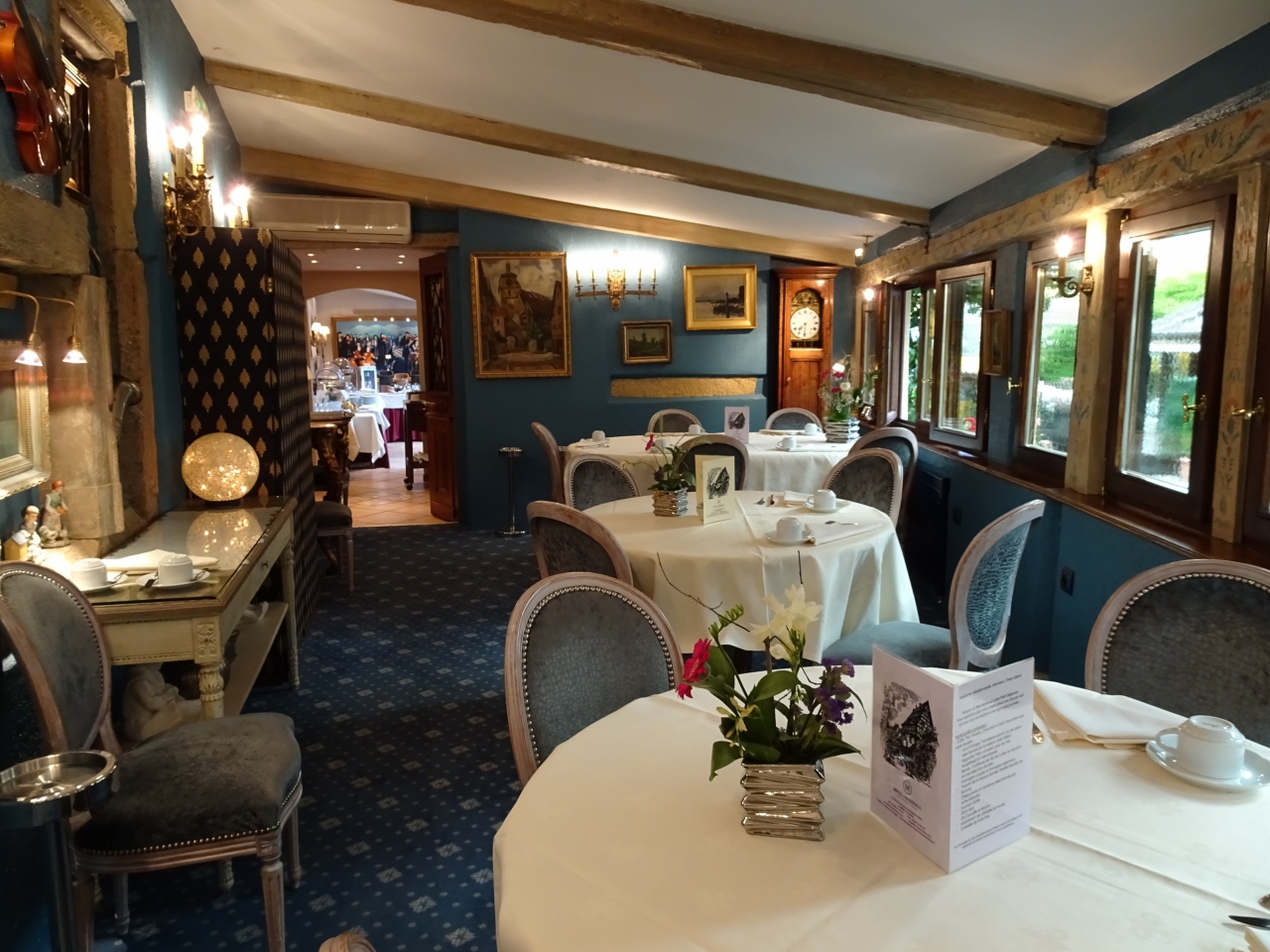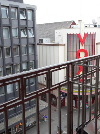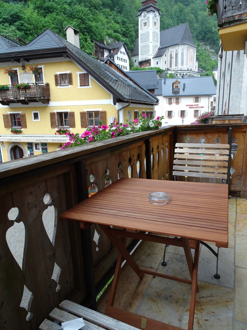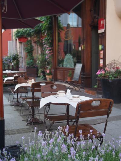 船着き場からすぐの、黄色い建物がゼーホテルグリューナーバウムです。マルクト広場に面していて、立地は最高です。泊まった部屋はバルコニーからマルクト広場が真ん前に見えました。レイクビューの部屋は美しい湖が見えます。私の部屋からは湖が見えないので、夕食の時にレストランの湖畔のテラス席で美しい湖を見ながらいただきました。