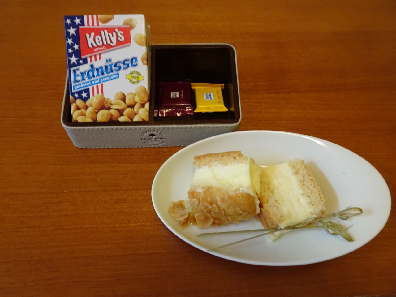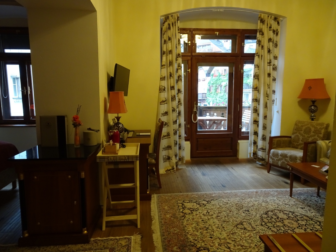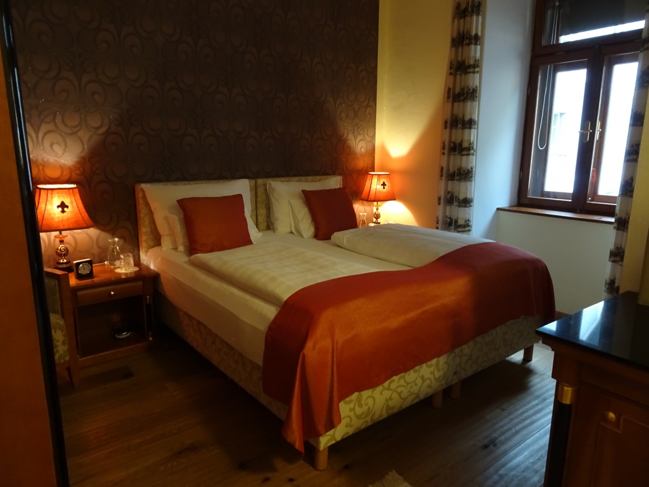 船着き場からすぐの、黄色い建物がゼーホテルグリューナーバウムです。マルクト広場に面していて、立地は最高です。泊まった部屋はバルコニーからマルクト広場が真ん前に見えました。レイクビューの部屋は美しい湖が見えます。私の部屋からは湖が見えないので、夕食の時にレストランの湖畔のテラス席で美しい湖を見ながらいただきました。