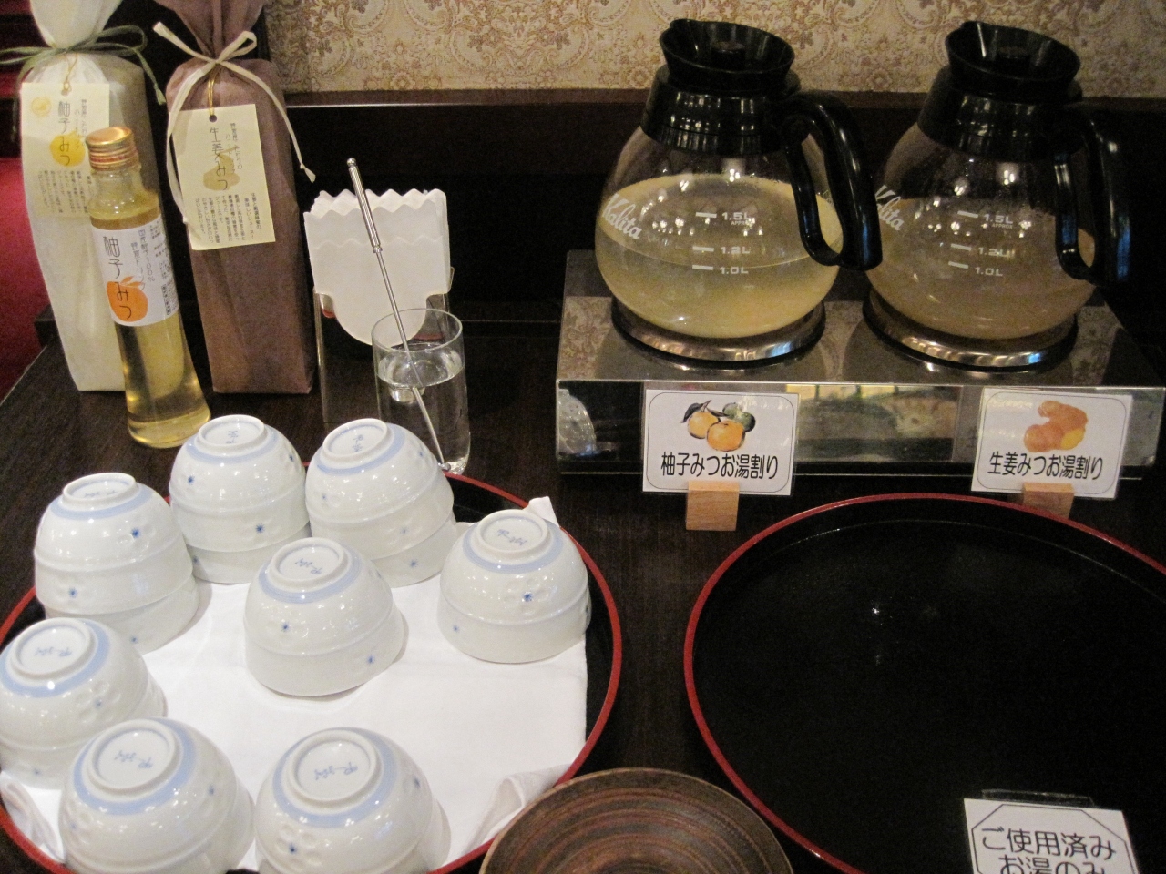 ロビーにはお茶のサービスがあります。私達が訪れた時は柚子の生姜の二種類の用意がしてありました。冬に行ったので温かいお茶はとても有難かったです。- 旅行時期