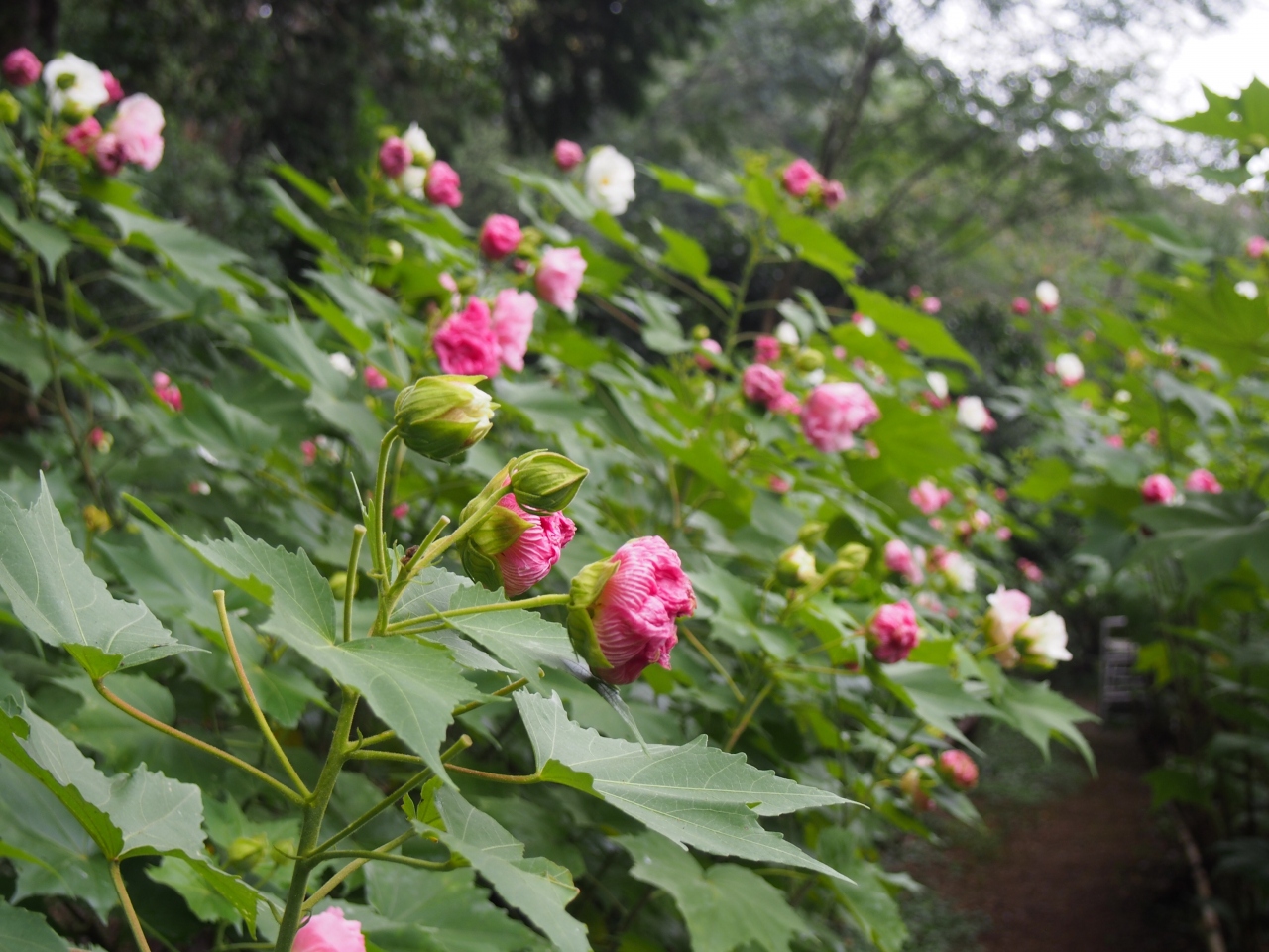 普段は観光客もほとんど居ない静かなお寺ですが、9月中旬から10月中旬までは酔芙蓉が境内一面に咲く花の寺です。20年ほど前に廃寺にならない様にと現在のご住職がツルハシ一本で参道づくりから始められた手作りのお寺です。
