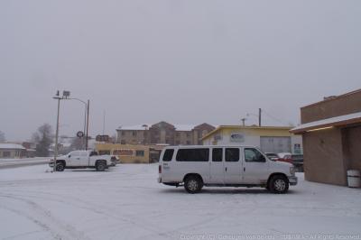 2度目の休憩をする頃には、道路も街も雪が積もっていました。手前のバンが...