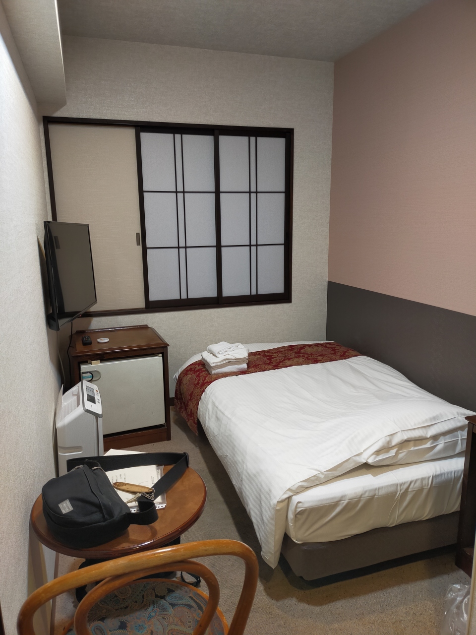 部屋は手狭で寝るだけなら問題ありません。施設が古めですが清掃は行き届いていると思います。冷蔵庫は宿泊客共用のものが1台置かれていました。- 旅行時期