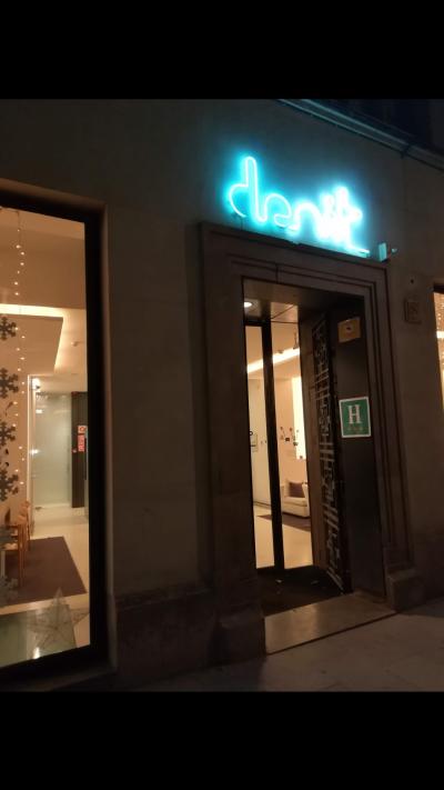 バルセロナ中心地とはいえ、薄暗い路地裏の道を通ることになるため、本当にホテルがあるのか疑いながら探すことになると思います。外から見たホテルの目印は、denitを一筆書きで表したインテリア文字です。