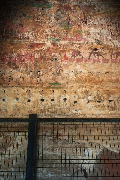 建物内は回廊式になっていて、回廊の壁は真っ白で装飾が無く一定間隔で仏像が配置されていますが、回廊を抜けると各方角に仏堂が設けられていて、大きな仏像が祀られており、天井まで描かれた壁画を見ることが出来ますが、崩壊が進んでいて保存状態が悪い&修復途中の状態でした。