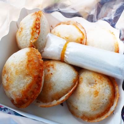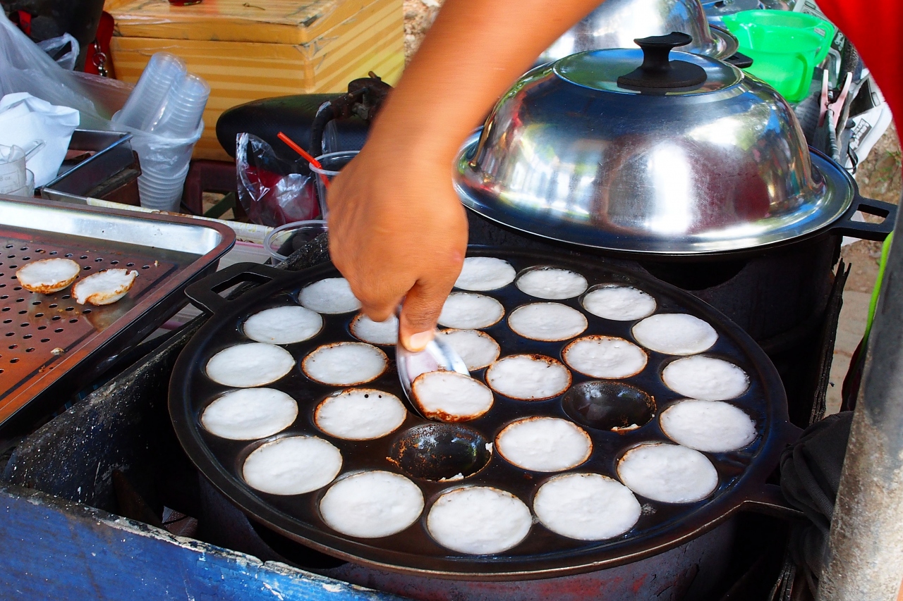 ココナッツミルクを使ったタイ伝統のお菓子:Khanom Krok(6個で20B)の店は大概お昼前に完売してしまって、午後からは別の屋台がやってくるので、Khanom Krokが目的なら午前中に行くのをお勧めします。- 旅行時期