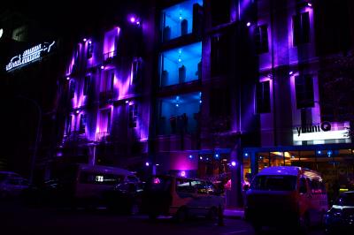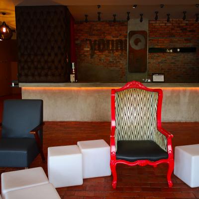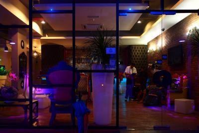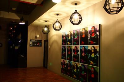 外観はとても怪しげなネオンカラーに包まれていて遠くから見ると変な建物ですが、フロントはインテリアに凝っていて個性的に創られています。