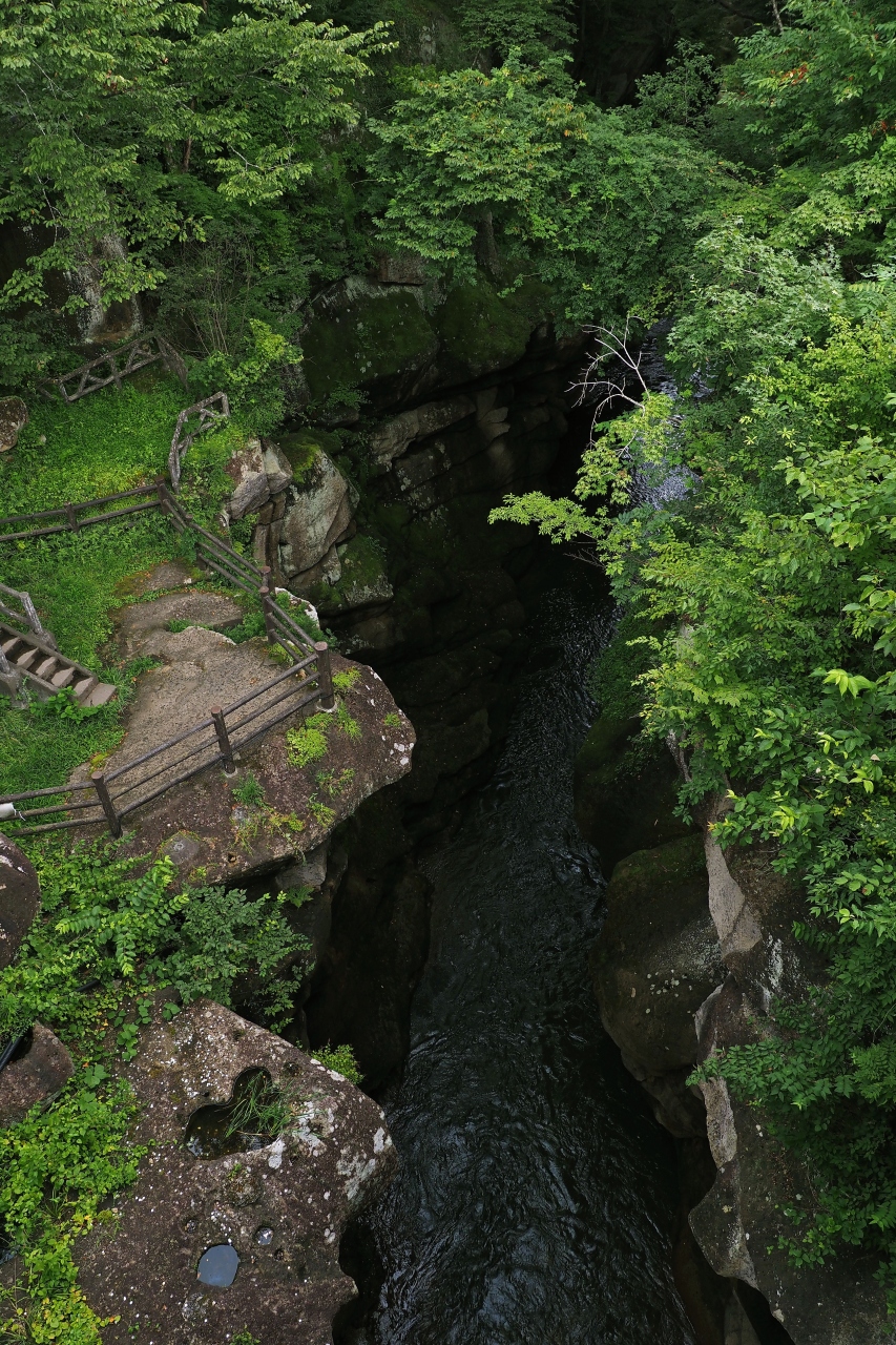 秋保温泉の入口にあたる名取川に架かった覗橋を渡ろうしたところ、急流に長年浸食されたことにより形成されたゴツゴツした岩の間を激しく川が流れるダイナミックな景色が広がっていました。