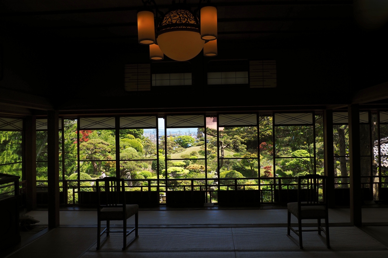 訪れた日は天気が良かったので、ある程度人が集まるとスタッフが清遠閣成り立ちを説明しながら、建築当初からそのままという貴重なガラス戸を半分片付けてくれ、柱などが額縁のような役割をして趣が景色が楽しめました。