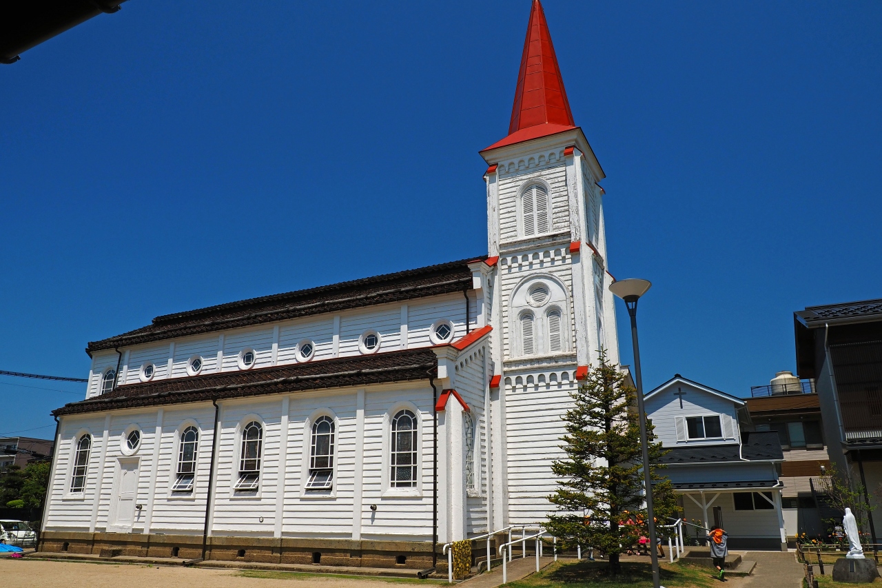 赤い尖塔が印象的な聖堂は、木造瓦葺のバジリカ型三廊ロマネスク様式で高さ23.7mあり、丸窓やアーチの窓などが明治ロマネスク様式建築を示しています。