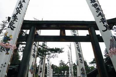 向かいの広場から掛け声が聞こえてくるので近づいてみると、【毘】と書かれた上杉軍の軍旗が翻り合戦の予行練習が行われていて、甲冑を装着した大勢の人が真剣に取り組んでおり、夕方からは武禘式軍団行列が行われて周辺が通行止めになるとのことで早めに退散しましたが、境内へ入ると、川中島大合戦に参戦した上杉軍の武将らの名前と肖像画が描かれた軍旗が等間隔で並べられており、凛とした空気が広がっていて圧巻でした(もしかしたら米沢上杉まつりの時期だけかもしれません)。- 旅行時期
