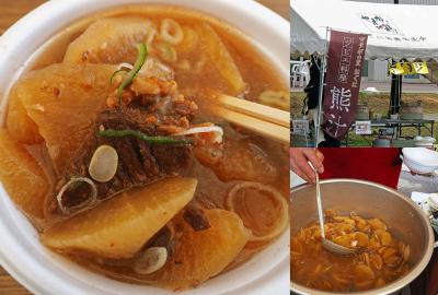 駐車場に設置された屋台では、マタギの風習や文化を今も受け継ぐ人々が仕留めた熊を使った熊汁を販売しており、タイミングが合えば小国の山で獲って自分たちで処理した熊汁が味わえます。