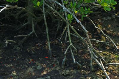 干潮になった地面を見ていると、小さな赤いベニシオマネキという蟹が片方だけ大きな爪を大袈裟に動かす姿はユニークですし、泥地と同化するかのように体調10cmほどの小さなミナミトビハゼの姿も見られました。