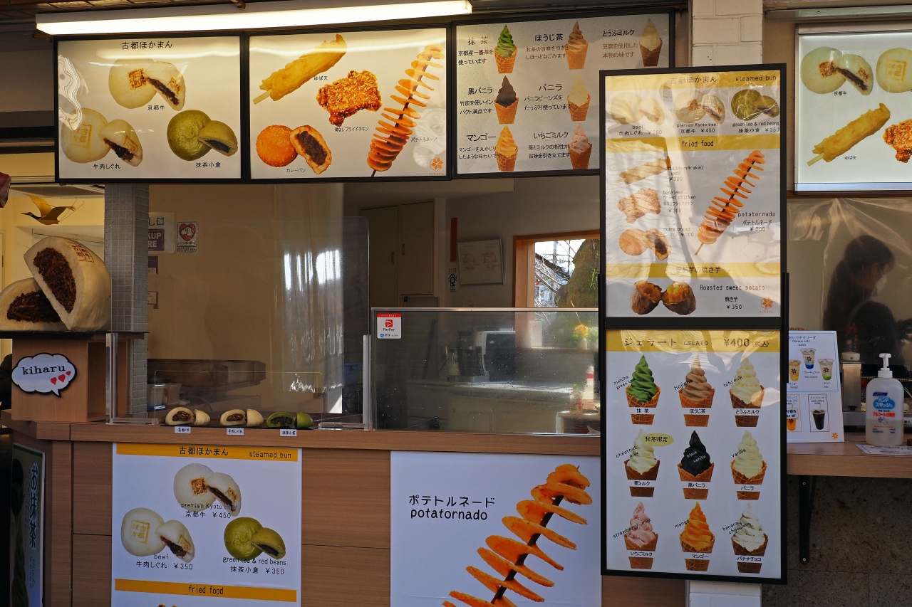 京都の味が楽しめる肉まん・ゆば天・ジェラートなどがあり、店内にはベンチが幾つか並べてあるので、スタンドで購入した食べ物を座って食べることが出来ました。