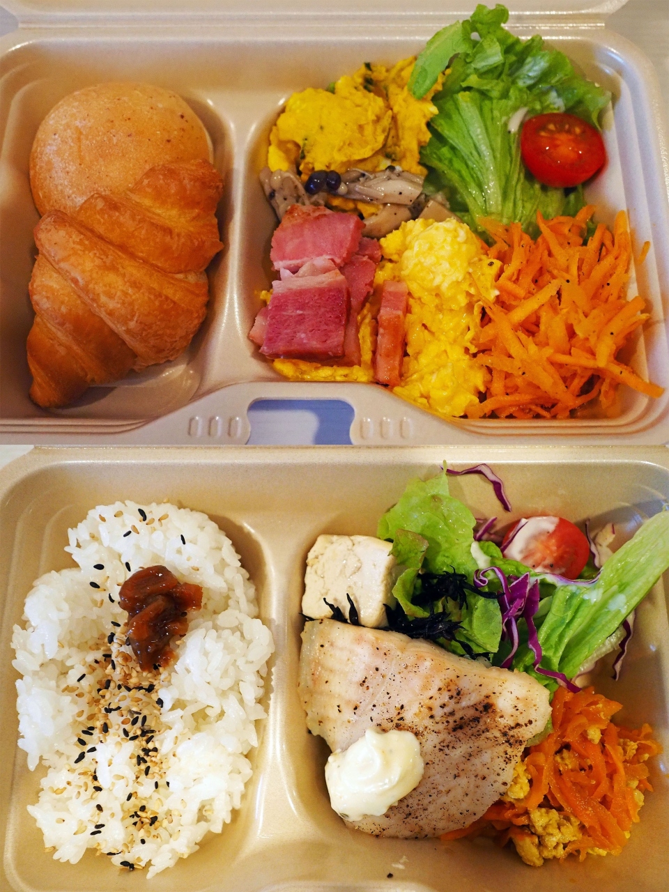 朝食はフロント前のカフェで食べることも可能だけど弁当スタイルで並べてあるから、紙に部屋番号と人数を記載して自室に持ち帰る人ばかりでした(セルフでホット珈琲・アイス珈琲・さんぴん茶・オレンジジュース・フレーバーウォーターも自由に飲める)。