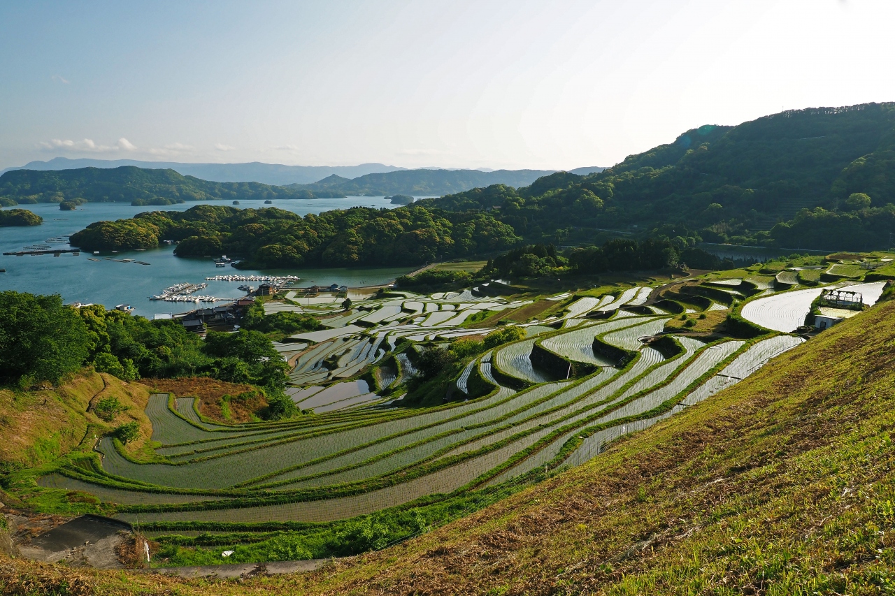 日本の棚田百選選定された、夕日の名所として知られる玄海町の浜野浦の棚田は、幾重にも連なる大小283枚の棚田が覆っていて、毎年4月中旬から田んぼの水張りが始まり、水が張られた5月上旬までの時期だけ、水田が鏡面のように輝いて空の色を映し出し、夕焼けのオレンジ色に染まる美しい光景を鑑賞できます。