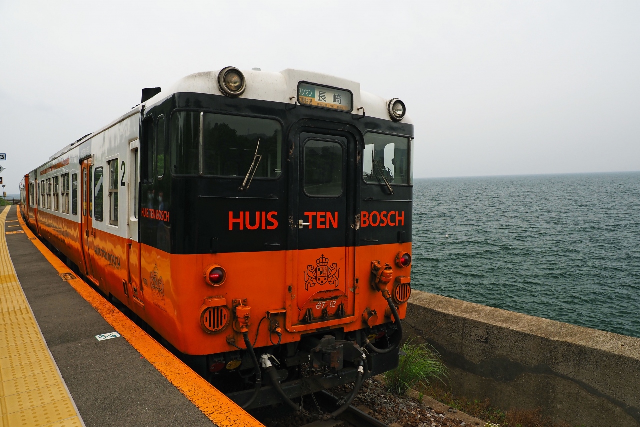 駅ホームに上がると、線路の向こうは内海の大村湾で、線路と海が隣り合わせており、単線のため想像以上に近くて驚きました。